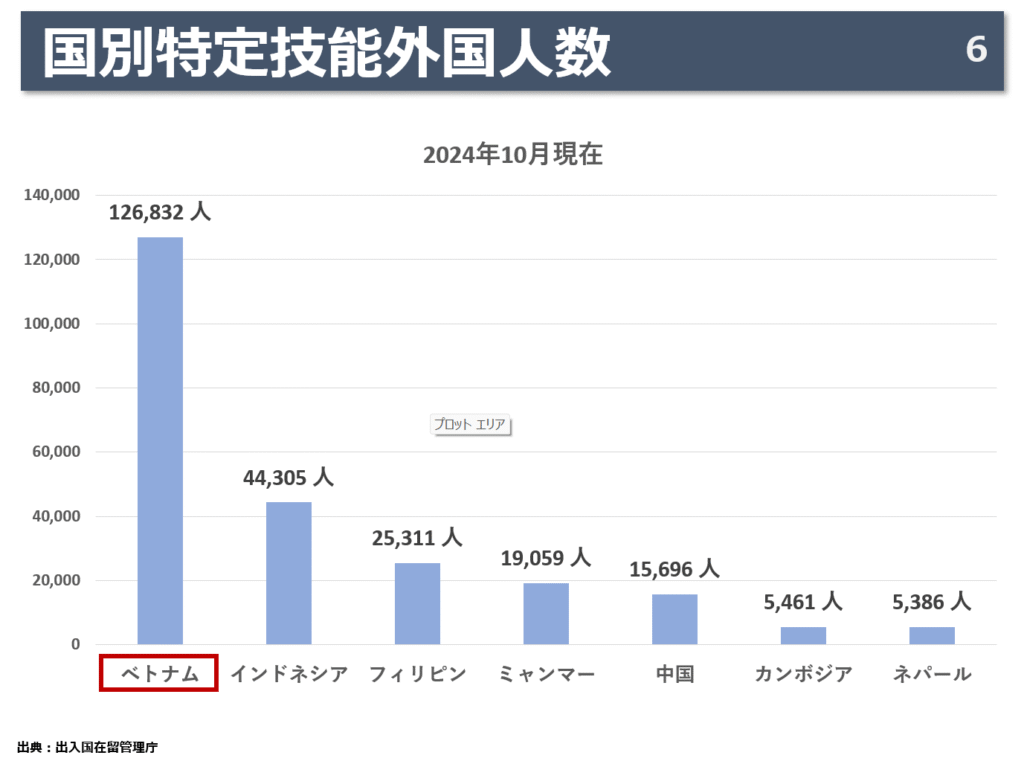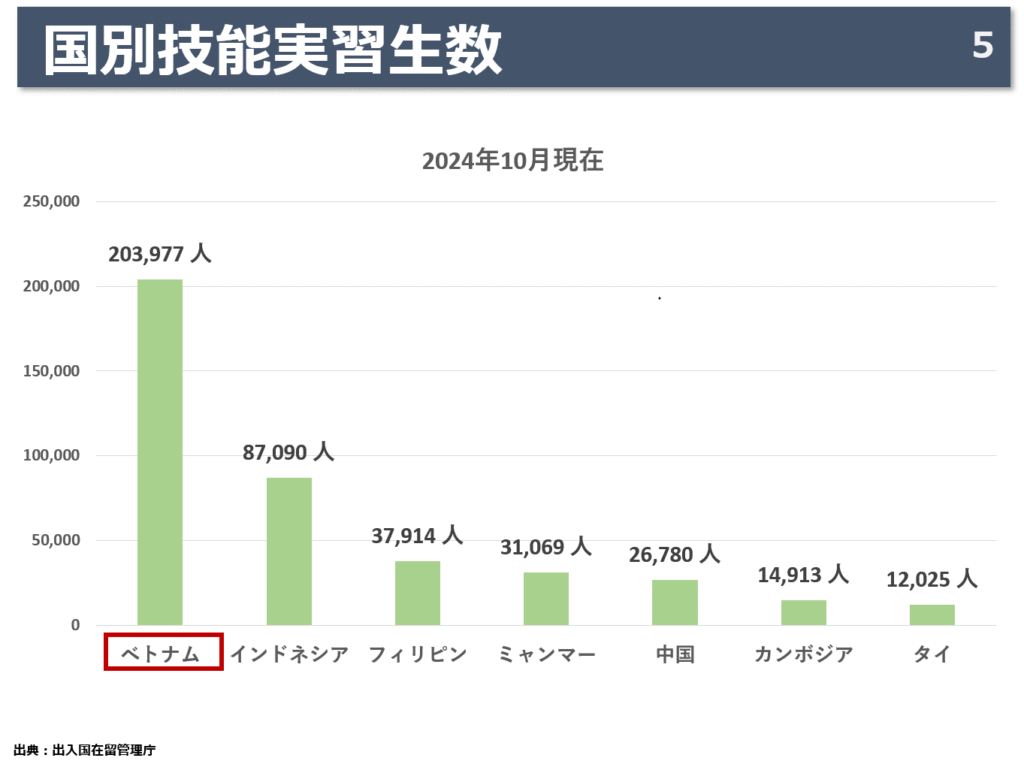現場でよく耳にする「技能実習」。国別の受入数を見ると、特徴がはっきり現れます。