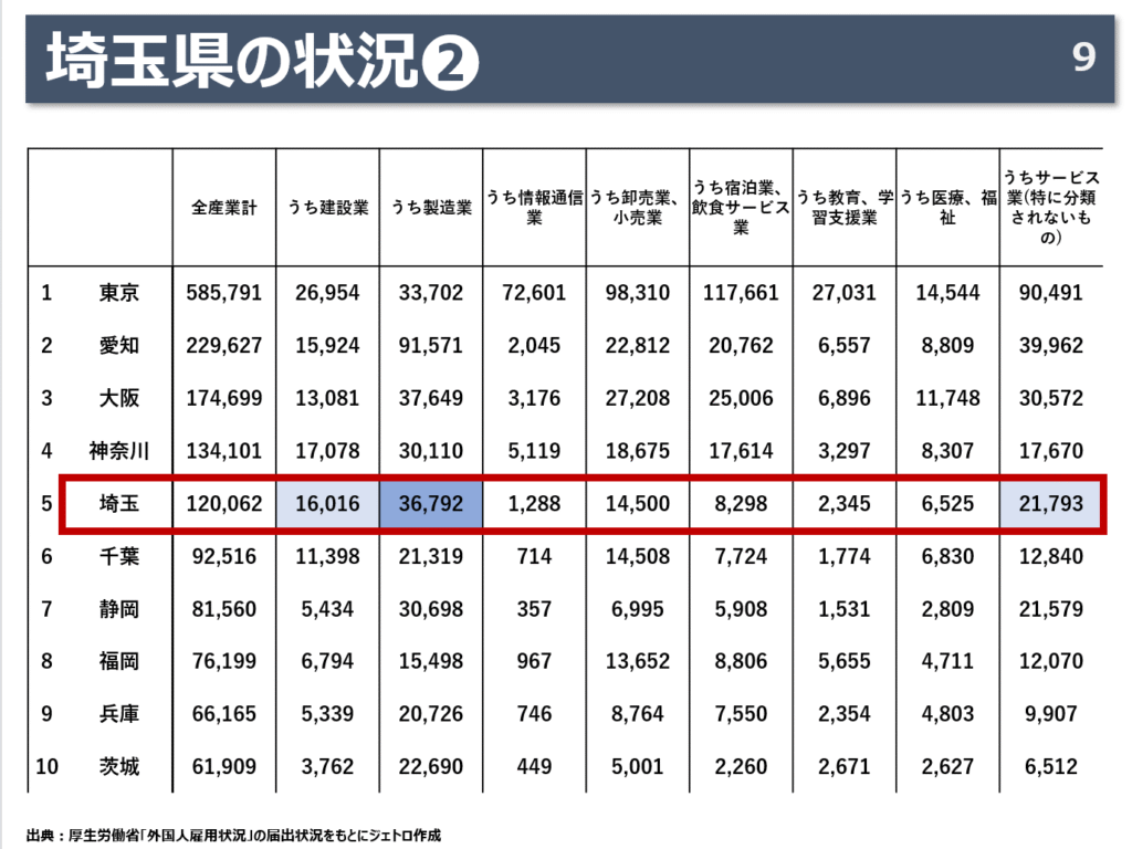 7. 埼玉県は全国5位の外国人労働者数|製造・建設・サービスで活躍