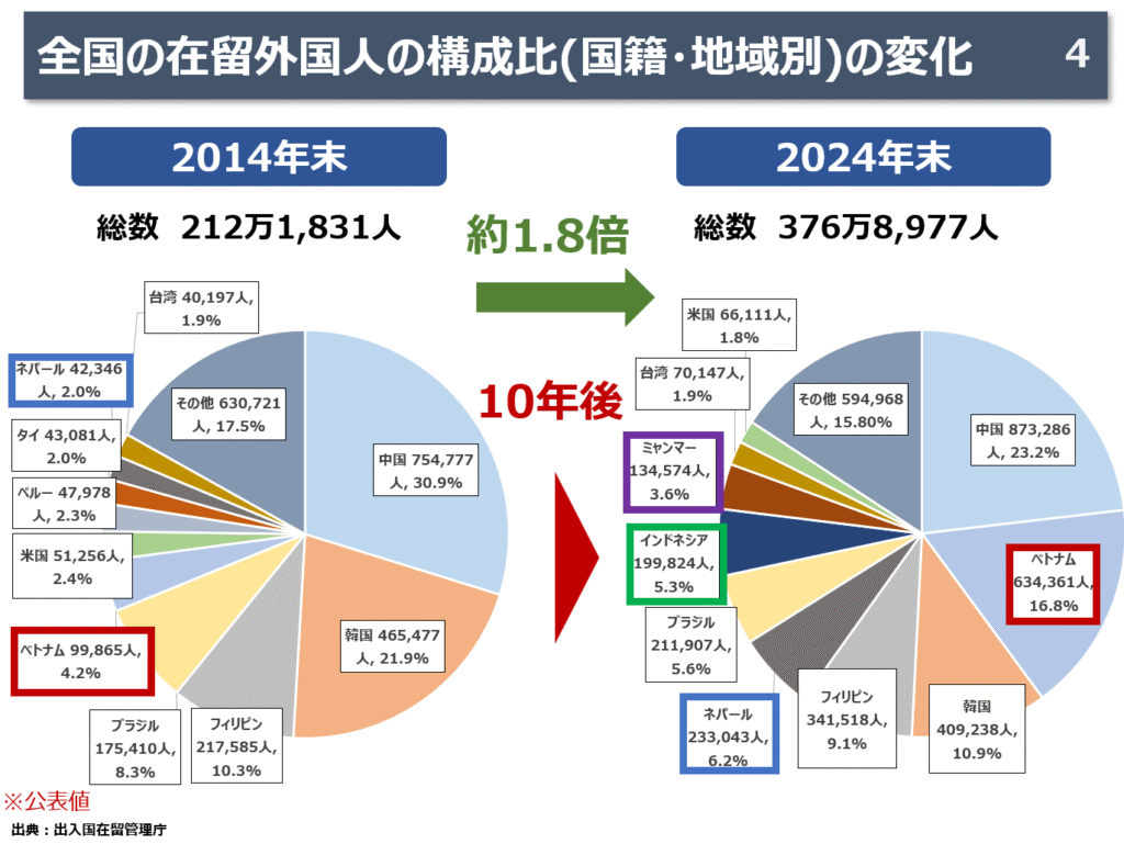 • ベトナム・ネパール・インドネシア・ミャンマーなど、東南アジア・南アジア出身者が大きく増加。