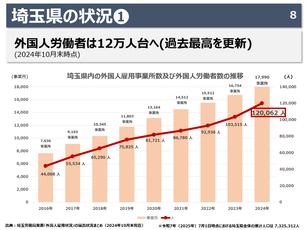 • 埼玉県の外国人労働者は12万人超で、全国5位